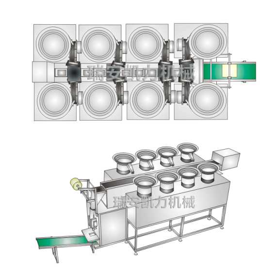 8 bowl feeder counting and packaging machine. Each bowl is designed as a dedicated vibrator (one feeder for one item). Relatively speaking, the time required for adjustment and modulation of the universal accessories are eliminated, resulting in efficient packaging operation.